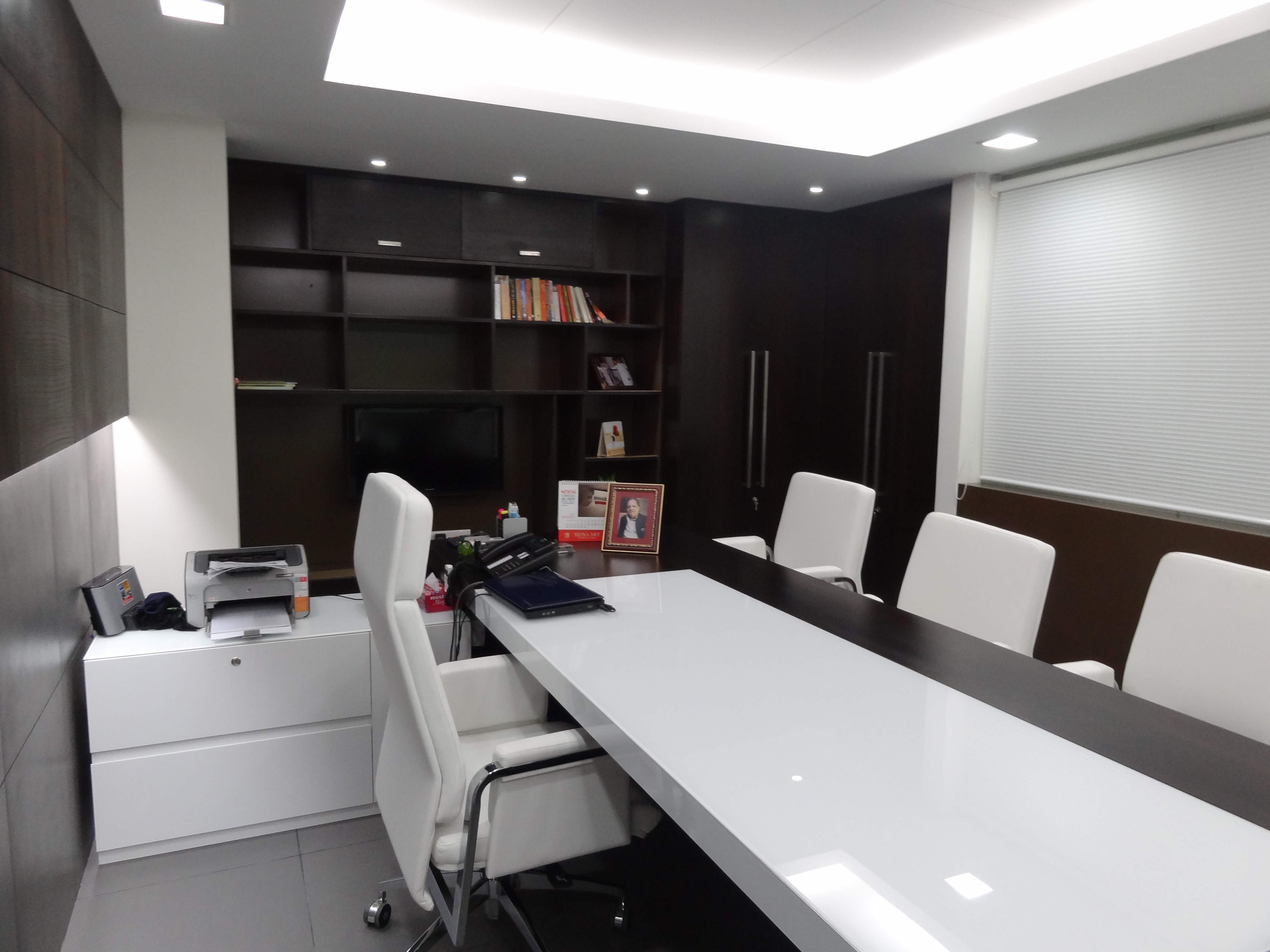 A sleek contemporary office where deep wood finishes, neutral tones, and integrated lighting create a sophisticated and efficient corporate workspace.