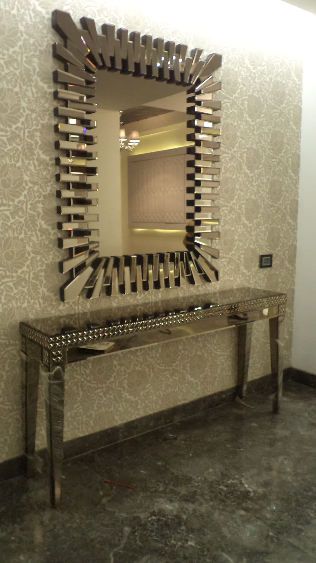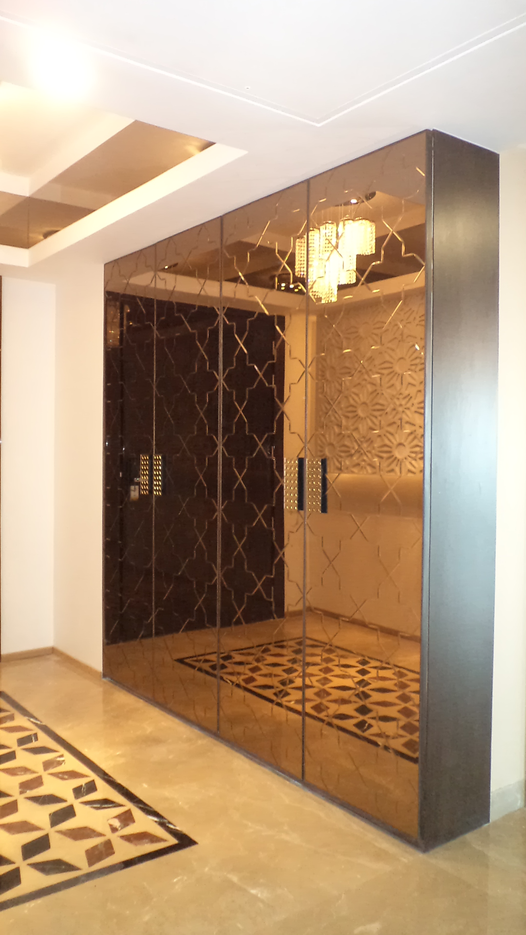 A contemporary luxury apartment where sculptural chandeliers, geometric marble inlays, and intricate jali screens balance modern minimalism with timeless elegance.