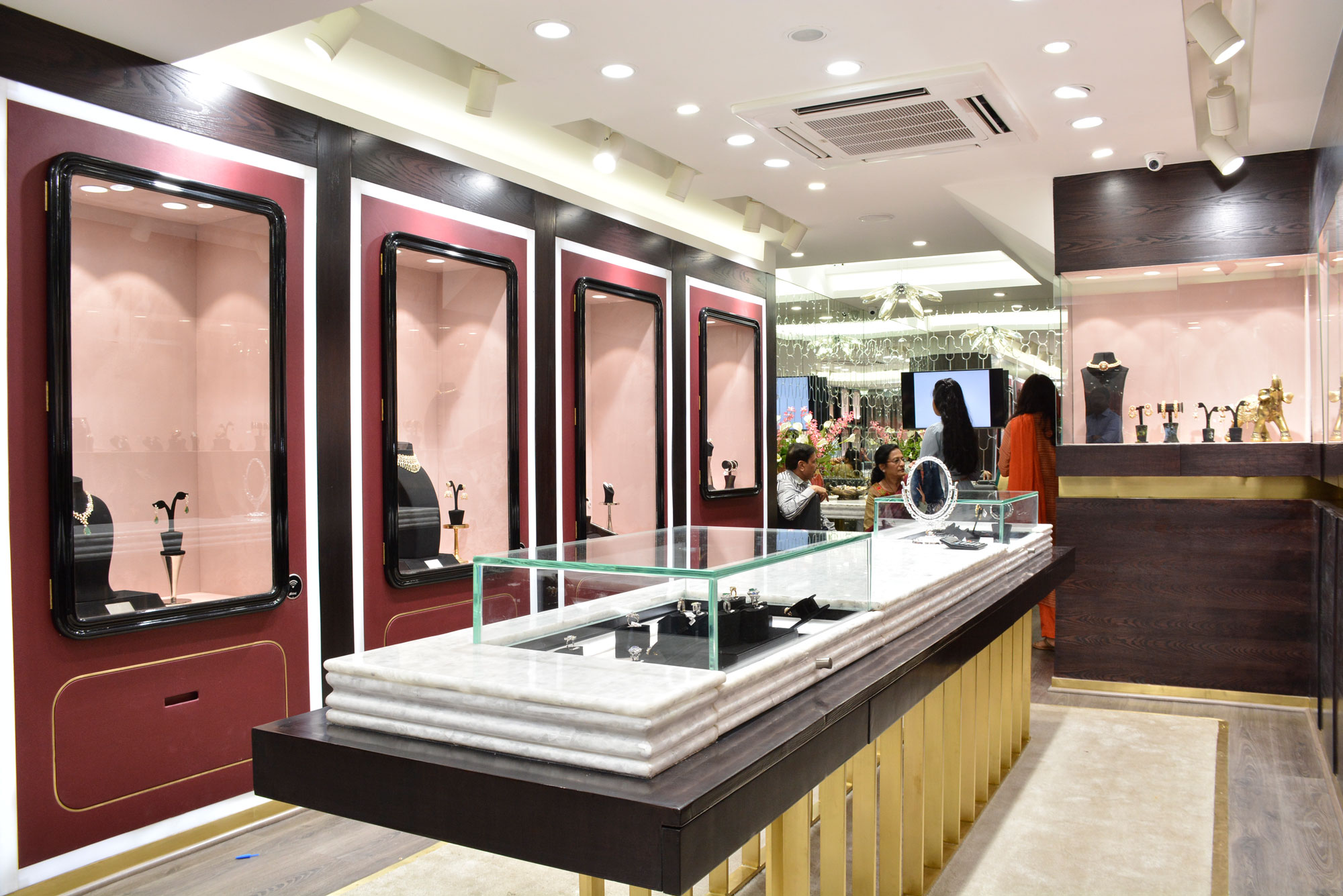 An ultra-luxury jewellery boutique where marble counters, rich wood, and brushed gold accents create an opulent setting with private consultation for an exclusive retail experience.